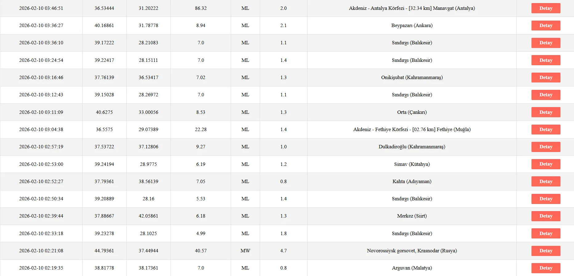 10 Şubat 2026 tarihinde Ege Denizi, Akdeniz, Balıkesir Sındırgı ve Kütahya Simav bölgelerinde kaydedilen depremler, AFAD’ın bu sisteminde güncel olarak yer aldı. Depremlere ilişkin tüm teknik bilgiler AFAD tarafından resmi kaynaklarda yayımlanmaya devam ediyor.