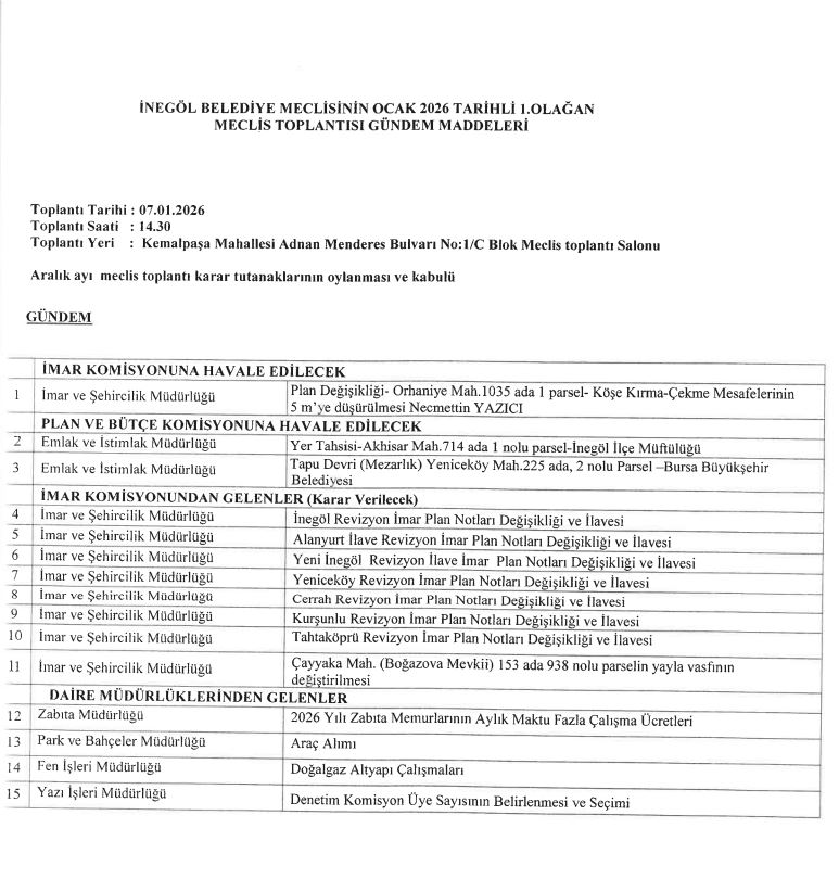İnegöl Meclisi bugün yılın ilk meclis toplantısı için bugün toplanıyor. Saat: 14:30'da yapılacak olan meclis toplantısında görüşülecek maddeler belli oldu. Mecliste toplam 15 madde görüşülecek. Maddeler arasında komisyona havale edecek maddelerde bulunuyor. Mecliste tüm gözler 11. maddeye çevrildi. 11. madde Boğazova'nın kaderini değiştirecek bu madde meclisten geçtiği takdirde kaçak olarak yapıldığı illeri sürülen yapılar resmi hale gelecek. Şimdi İnegöllülerin gözü kulağı İnegöl Meclisine çevrildi. Komisyonda ise Saadet Partisi bu maddeye red oyu verirken, MHP ise çekimser kalmayı tercih etti. Ancak Ak partinin komisyondaki üyeleri ise maddeyi oy çokluğuyla kabul ederek meclise maddenin gelmesini sağladı.