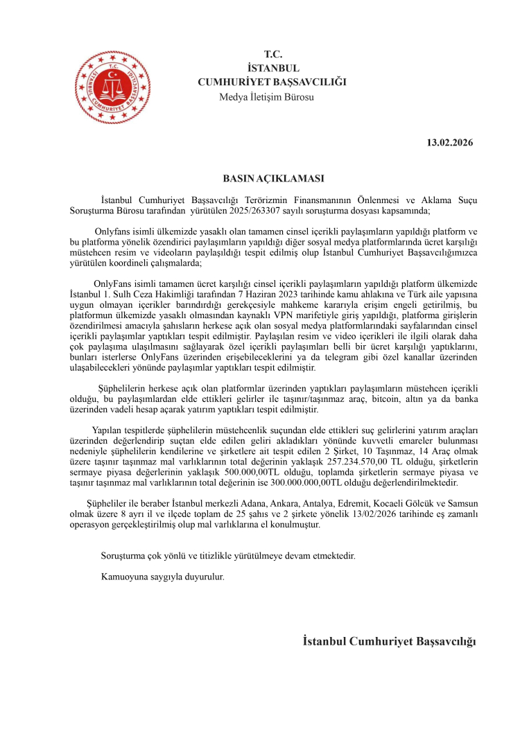 İSTANBUL (İGFA) - İstanbul Cumhuriyet Başsavcılığı Terörizmin Finansmanının Önlenmesi ve Aklama Suçu Soruşturma Bürosu tarafından yürütülen 2025/263337 sayılı soruşturma kapsamında, kamuoyunda 'OnlyFans soruşturması' olarak bilinen dosyada önemli bir operasyon gerçekleştirildi.
