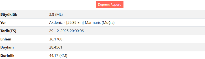 Deprem, 29 Aralık 2025 tarihinde saat 20.00.06’da kaydedildi. Yerin 44,17 kilometre derinliğinde meydana gelen depremin merkez üssünün, Marmaris’e yaklaşık 59,89 kilometre mesafede olduğu bildirildi. Depremin koordinatları enlem 36.1708 ve boylam 28.4561 olarak açıklandı.