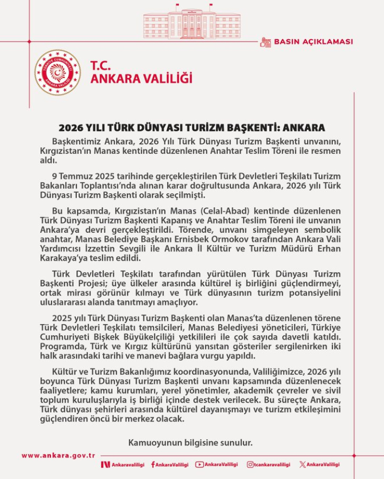 Cumhuriyetin başkenti Ankara, Türk Devletleri Teşkilatı kararıyla 2026 yılı 'Türk Dünyası Turizm Başkenti' oldu. Unvan, Kırgızistan'ın Manas kentinde düzenlenen törenle Ankara'ya teslim edildi.