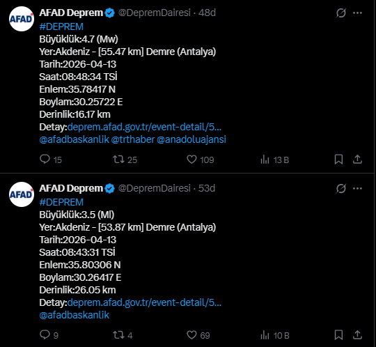 Demre ilçesine 55,47 kilometre uzaklıkta meydana gelen bu ikinci depremin büyüklüğü 4.7 olarak tespit edildi. AFAD verilerinde, sarsıntının yüzeye daha yakın bir noktada, 16,17 kilometre derinlikte kırıldığı ifade edildi