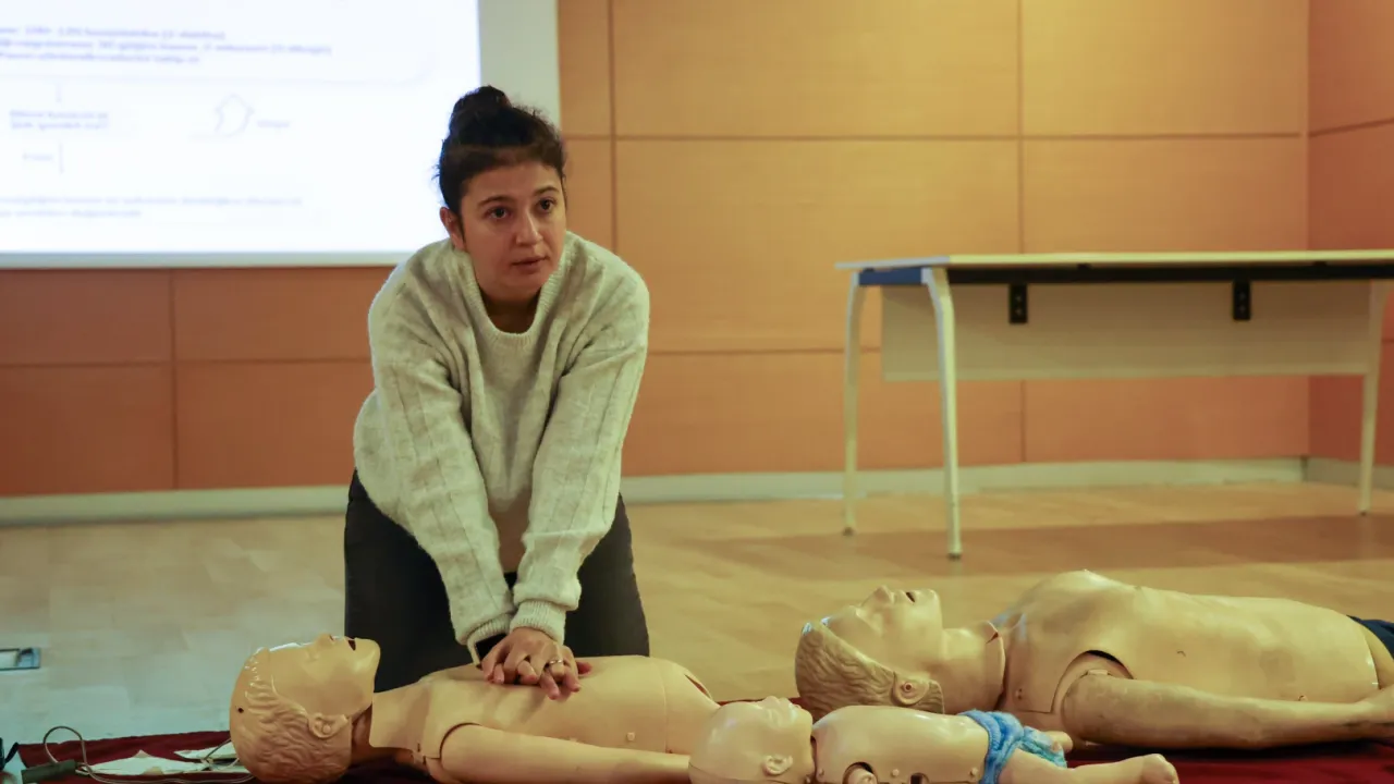 Uygulamalı bölümde ise mankenler ve ilk yardım ekipmanlarıyla çalışıldı. Katılımcılar, mankenler üzerinde kalp masajı ve suni solunum tekniklerini birebir deneyimleme fırsatı buldu.
