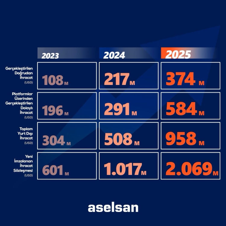 ASELSAN'ın ihracat başarısının yalnızca ürün satışlarıyla sınırlı olmadığına dikkat çekilen açıklamada; hava savunma sistemleri, radar, elektronik harp, güdümlü mühimmat ve haberleşme teknolojileri gibi doğrudan ihracatların yanı sıra, uçaklar, SİHA'lar, gemiler ve kara platformlarına entegre edilen sistemler aracılığıyla da ihracatın artarak devam edeceği belirtildi.