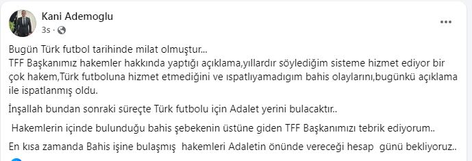 Sosyal medya hesabından açıklama yapan İnegölspor Başkanı Kani Ademoğlu, "Bugün Türk futbol tarihinde milat olmuştur. TFF Başkanımız hakemler hakkında yaptığı açıklama, yıllardır söylediğim sisteme hizmet ediyor birçok hakem, Türk futboluna hizmet etmediğini ve ispatlayamadığım bahis olaylarını, bugünkü açıklama ile ispatlanmış oldu. İnşallah bundan sonraki süreçte Türk futbolu için adalet yerini bulacaktır. Hakemlerin içinde bulunduğu bahis şebekenin üstüne giden TFF Başkanımızı tebrik ediyorum. En kısa zamanda Bahis işine bulaşmış hakemleri Adaletin önünde vereceği hesap günü bekliyoruz."