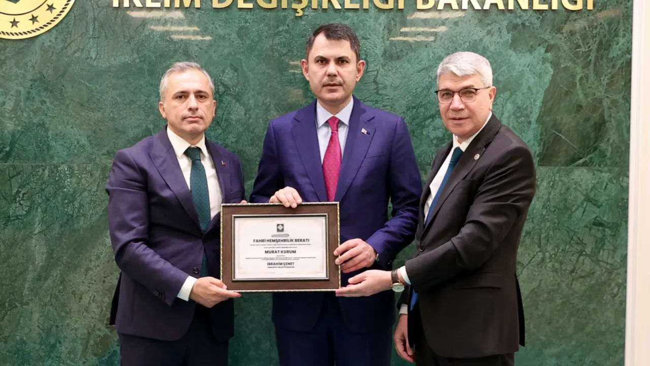 Başkan Çenet, Osmaniye'de gösterdiği özverili çalışmalarından Bakan Kurum'a teşekkür ederek, 'Özellikle 6 Şubat depreminden sonra tüm deprem illerine olduğu gibi Osmaniye'mize göstermiş olduğu o yakın ilgi için ve şehrimizin yeniden depreme dayanıklı bir şehir olarak inşasını sağladığı için Osmaniye Belediyesi Meclisi size Fahri Hemşehrilik beratı verme kararı aldı. Ben de bunu zatıalinize takdim ediyorum. Sadece deprem konutları değil, iş yerleri, çarşılar, pazarlar, meydanlar da yapıldı' ifadelerini kullandı.
