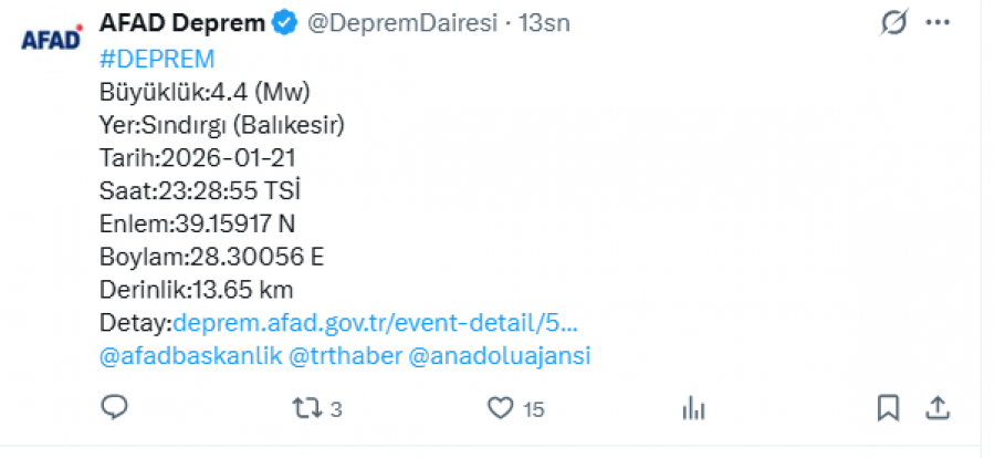 23.28'de meydana gelen deprem yerin 13.65 kilometre altında gerçekleşti.