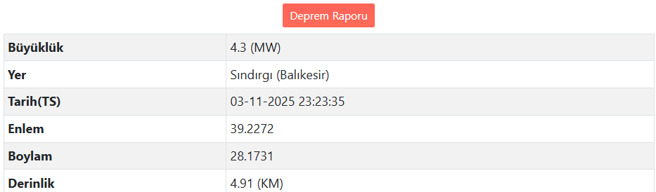 Afet ve Acil Durum Yönetimi Başkanlığı (AFAD) verilerine göre, Balıkesir’in Sındırgı ilçesinde saat 23.23’te 4.3 büyüklüğünde deprem meydana geldi. Deprem Bursa başta olmak üzere çevre illerde hissedildi.