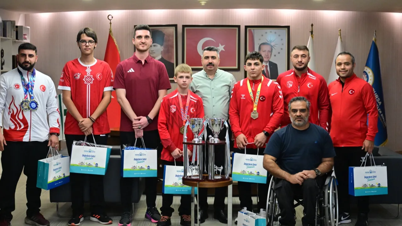 Katıldıkları uluslararası turnuvalarda ülkemizi ve Yıldırımı gururlandıran Toprak Aras, Yusuf İslam Kara, Batın Naniş ve Enes Gezer'i makamında ağırlayan Yıldırım Belediye Başkanı Oktay Yılmaz, başarılı sporcuları tebrik etti. Yıldırım'ın spor kenti kimliğini güçlendirmek için çalıştıklarını vurgulayan Başkan Oktay Yılmaz; 'Gerek tesisleşme hamlemiz gerekse de spor kurslarımız ve eğitimlerimizle Yıldırım'ı adeta bir spor kentine çevirdik. Hamdolsun bu yatırımlarımız da meyvelerini veriyor. Sporcularımız katıldıkları ulusal ve uluslararası turnuvalarda ülkemizi ve bizleri gururlandıran önemli başarılara imza atıyorlar. Bu başarılar eminim ki, çocuklarımıza ve gençlerimize ilham olacak bir yol açacaktır. Ben tüm sporcularımızı tebrik ediyor ve başarılarının devamını diliyorum. Spora ve sporcuya olan desteğimiz bundan sonra da artarak devam edecek ifadelerini kullandı.