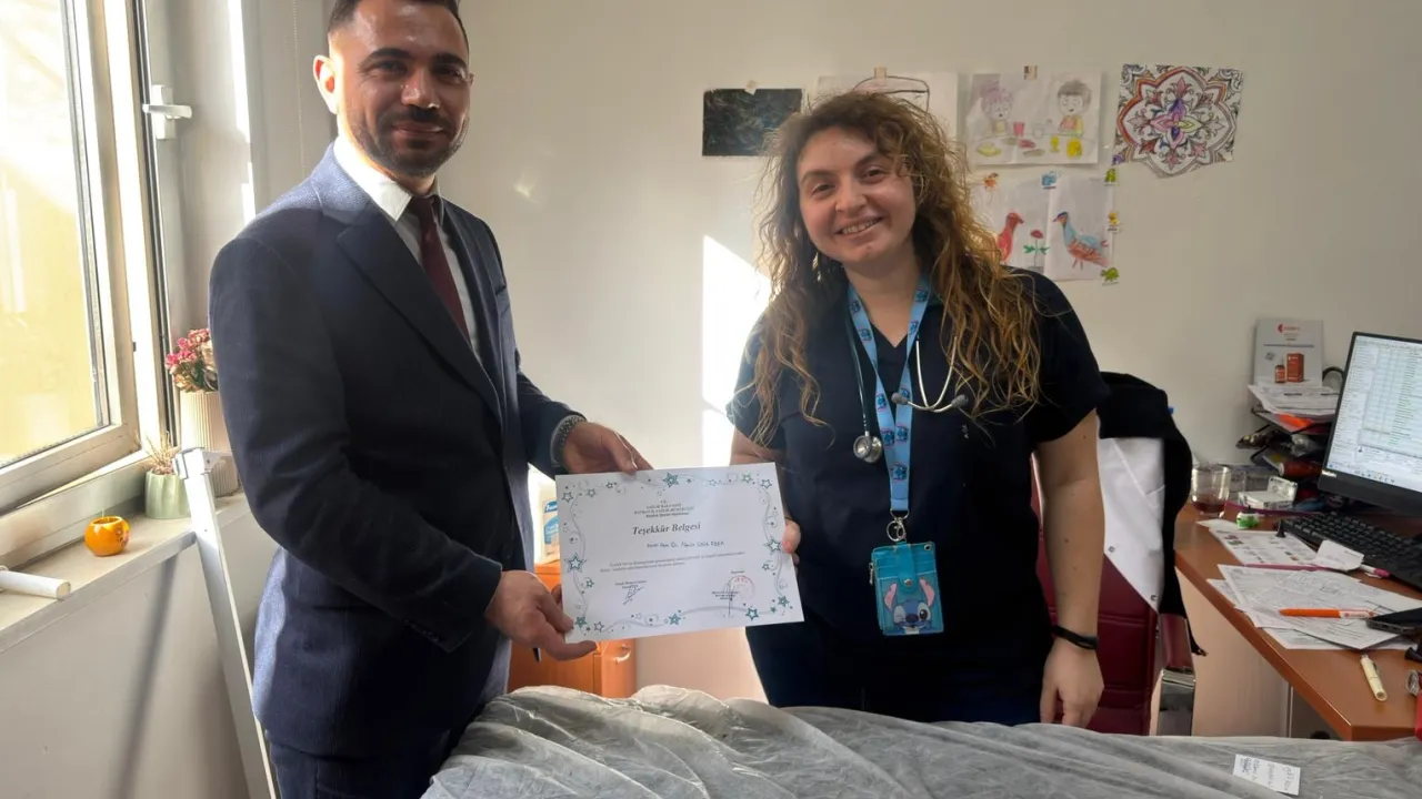 Başhekim Dr. Fırat Güneş, hasta odaklı sağlık hizmetinin önemine vurgu yaparak, özverili çalışmaları ve çocuk hastalarla kurduğu güçlü iletişim dolayısıyla Uz. Dr. Nevin Çelik Fişek'e teşekkür etti.
