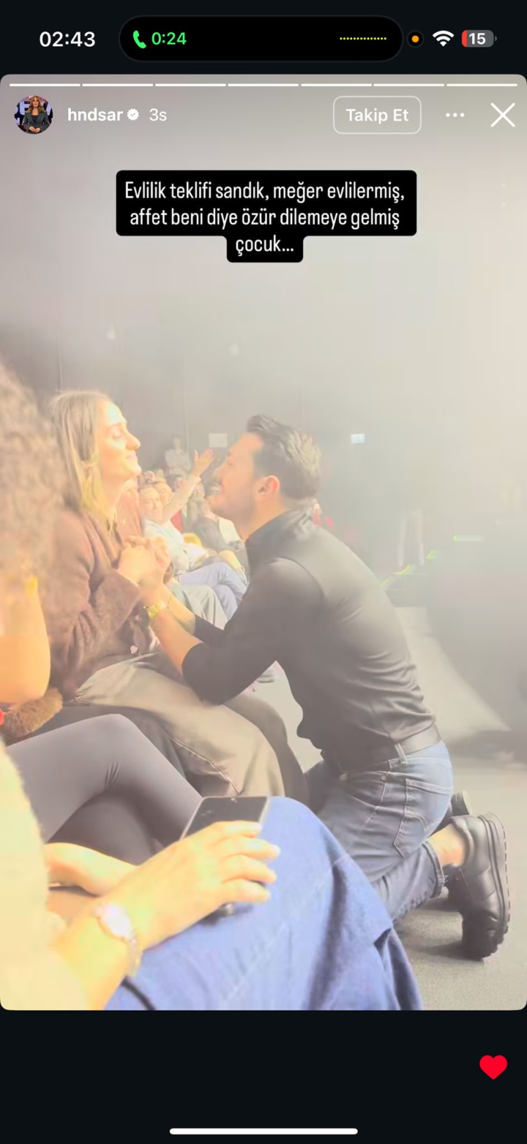 Bu anları konser izleyenler arasında olan ünlü haber spikeri Hande Sarıoğlu sosyal medyasından 'Evlilik teklifi sandık, meğer evlilermiş, affet beni diye özür dilemeye gelmiş çocuk...' notuyla paylaştı.