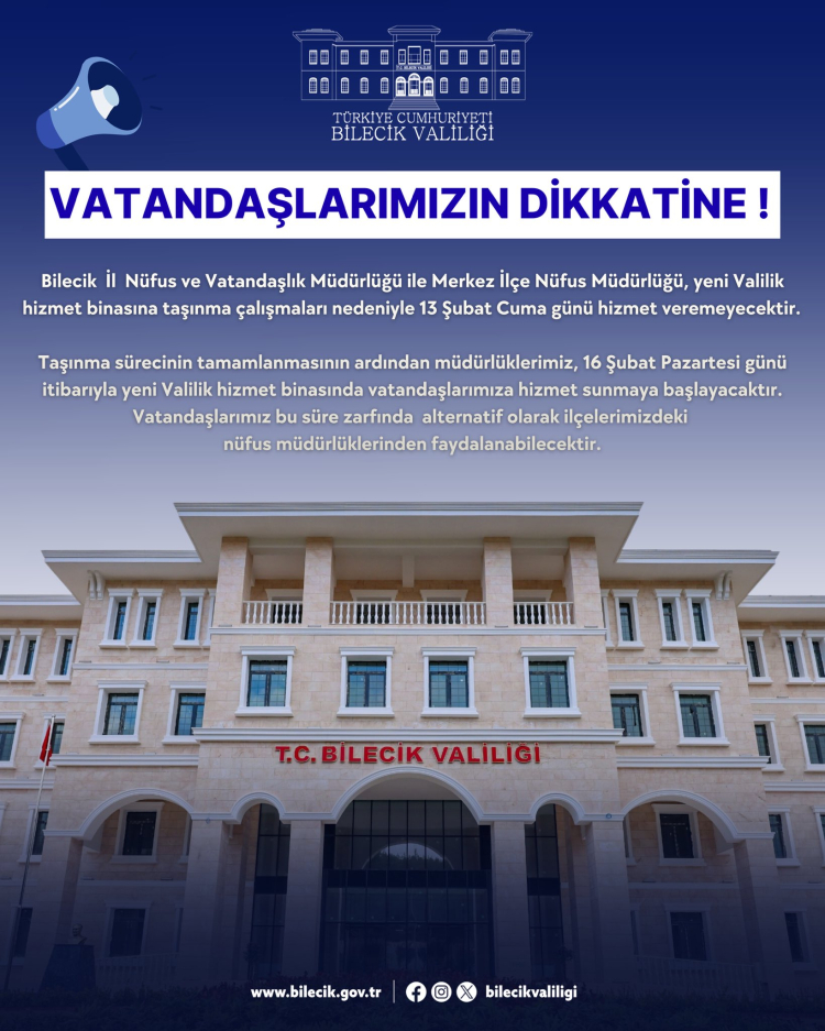 Bilecik Valiliği, İl Nüfus ve Vatandaşlık Müdürlüğü ile Merkez İlçe Nüfus Müdürlüğü'nün yeni Valilik hizmet binasına taşınma süreci nedeniyle geçici olarak hizmet veremeyeceğini duyurdu.