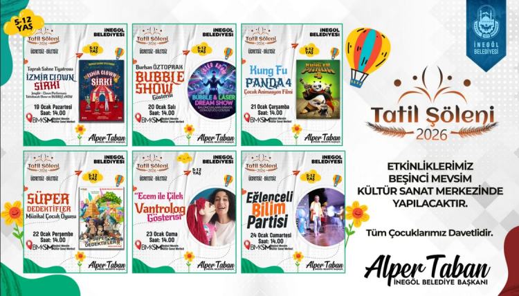 İnegöl Belediye Başkanı Alper Taban, ara tatilde çocukların keyifli ve verimli vakit geçirmesini önemsediklerini belirterek, 'Çocuklarımızın yüzünü güldürecek, hayal dünyalarını geliştirecek ve güzel anılar biriktirecekleri bir tatil programı hazırladık. Tüm çocuklarımızı Tatil Şöleni 2026 etkinliklerimize davet ediyorum.' dedi.