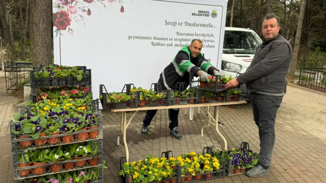 İnegöl Belediyesi, Ramazan Bayramı arifesinde mezarlık ziyaretine gelen vatandaşlara ücretsiz 9 bin adet çiçek dağıtarak anlamlı bir uygulamayı bu yıl da sürdürdü.