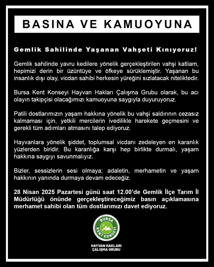 Bursa Kent Konseyi Hayvan Hakları Çalışma Grubu, Gemlik sahilinde yavru kedilere yönelik vahşi bir katliamı kınayan bir açıklama yaptı.