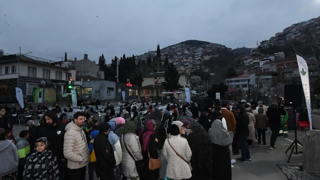 BURSA (İGFA) - Osmangazi Belediyesi tarafından Alacahırka Pazar Alanı'nda düzenlenen iftar programında vatandaşlar, Ramazan'ın bereketini ve paylaşma kültürünü aynı sofrada buluşarak hissetti. İftar saatinin yaklaşmasıyla birlikte pazar alanını dolduran mahalle sakinleri kurulan uzun sofralarda yerlerini alırken, programa katılan Osmangazi Belediye Başkanı Erkan Aydın'a belediye başkan yardımcıları ve meclis üyeleri eşlik etti.