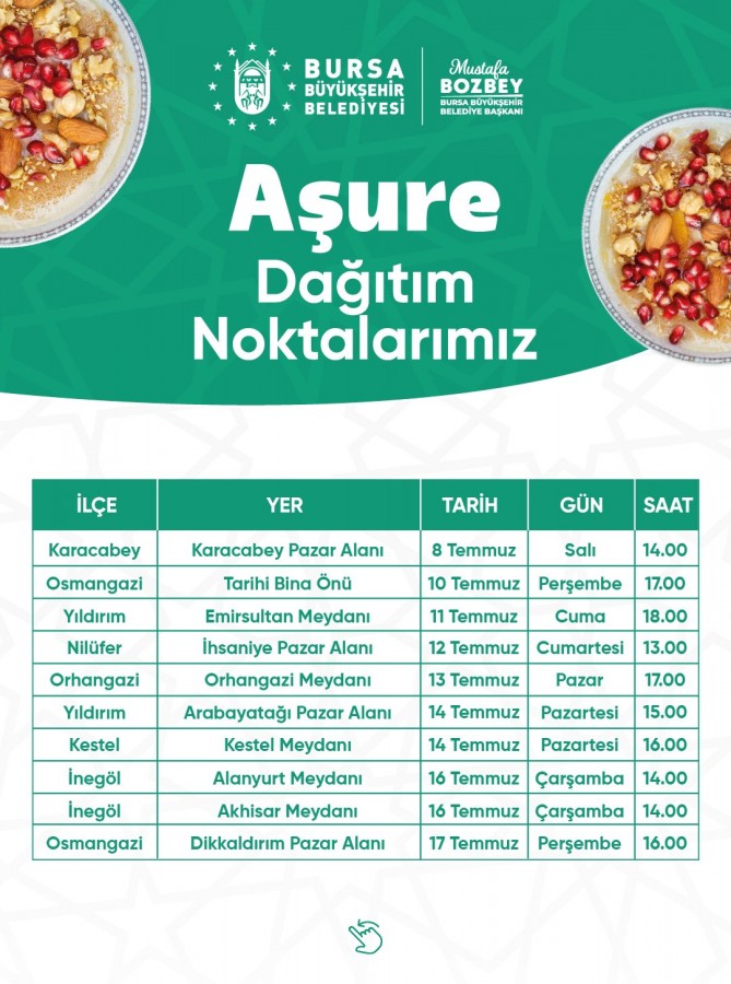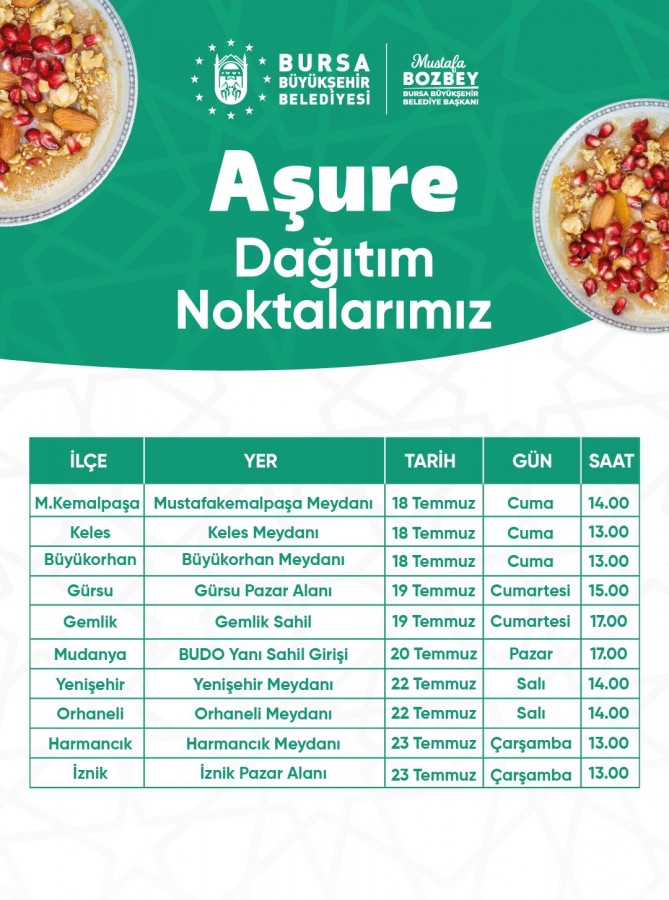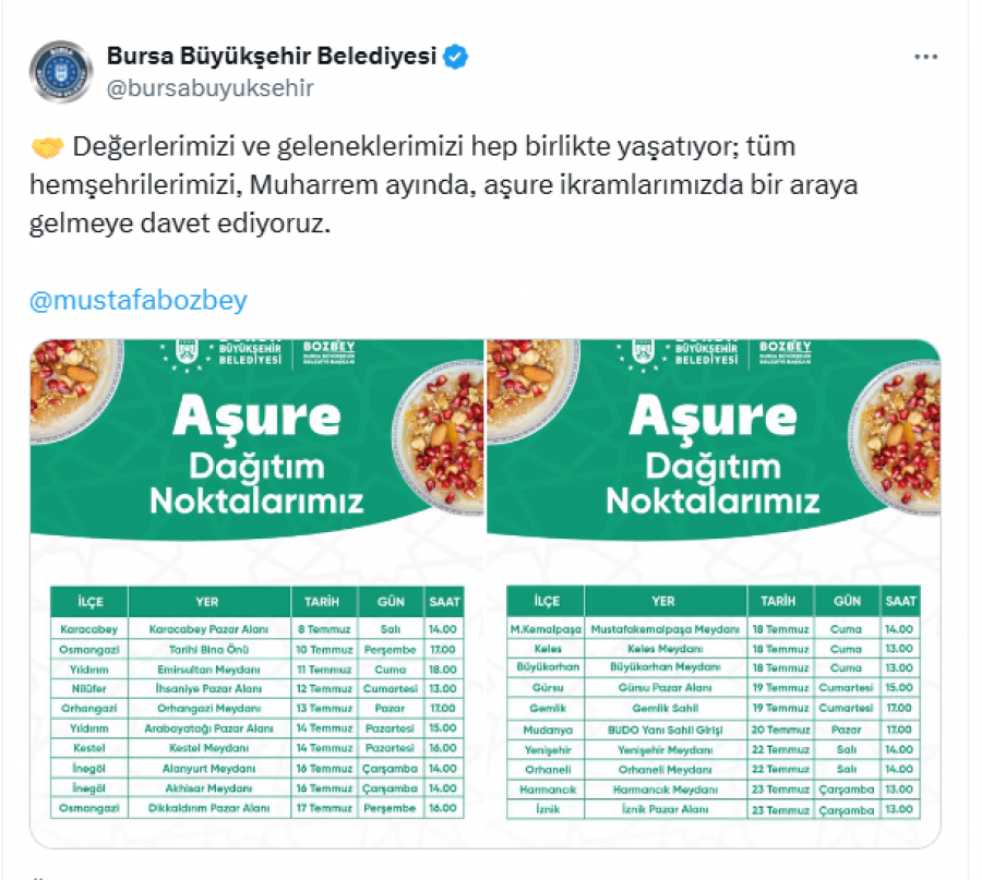 Bursa Büyükşehir Belediyesi sosyal medyadan yaptığı paylaşımda, "Değerlerimizi ve geleneklerimizi hep birlikte yaşatıyor; tüm hemşehrilerimizi, Muharrem ayında, aşure ikramlarımızda bir araya gelmeye davet ediyoruz. dedi.