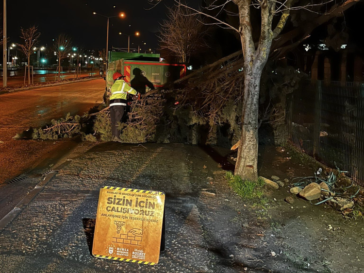 Bursa'da etkili olan kuvvetli lodos hayatı olumsuz etkilerken, Bursa Büyükşehir Belediyesi ekipleri olası risklere karşı çalışmalarını aralıksız sürdürüyor.