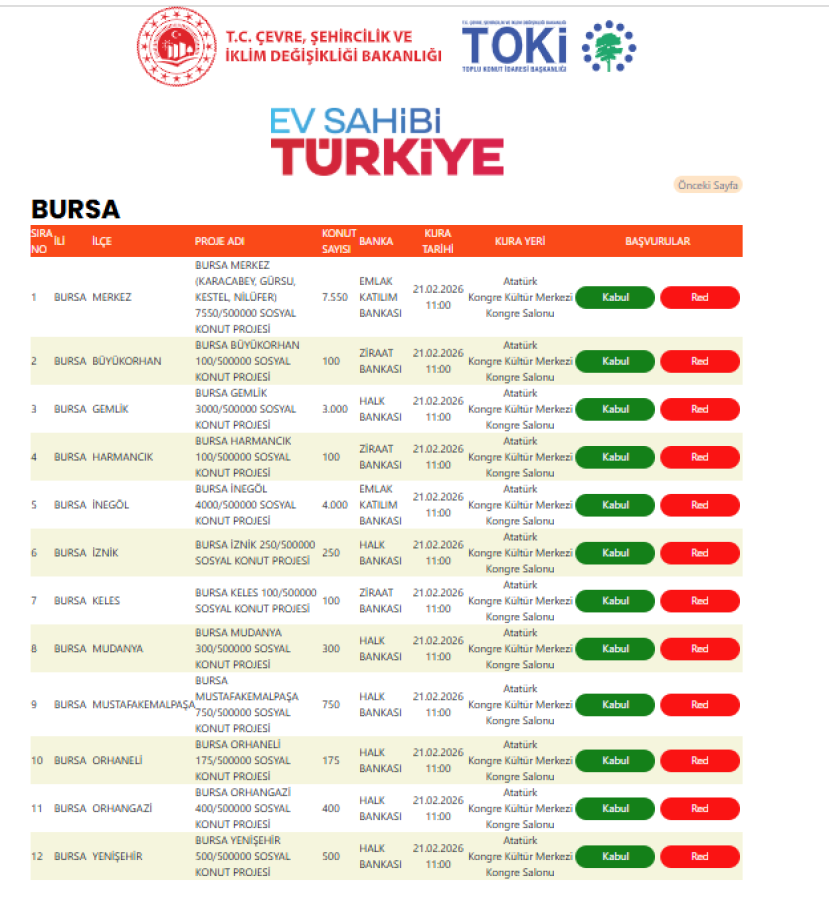 oplu Konut İdaresi Başkanlığı (TOKİ) tarafından Bursa'da hayata geçirilecek "Yüzyılın Konut Projesi" kapsamında inşa edilecek 17 bin 225 konut için hak sahipleri belirlenecek. 21 Şubat 2026 Cumartesi Günü gerçekleşecek çekiliş için Nihai TOKİ Listesi açıklanırken, başvuru sürecini tamamlayan vatandaşlar kura heyecanı yaşayacak.