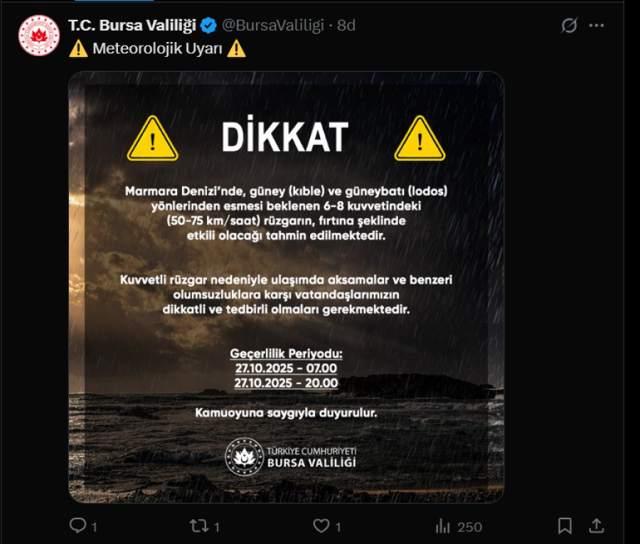Bursa Valiliğinden yapılan açıklamaya göre, 27 Ekim 2025 Pazartesi günü sabah saatlerinden itibaren güney (kıble) ve güneybatı (lodos) yönlerinden esmesi beklenen 6-8 kuvvetindeki (50-75 km/saat) rüzgarın, yer yer fırtına şeklinde etkili olacağı tahmin ediliyor.