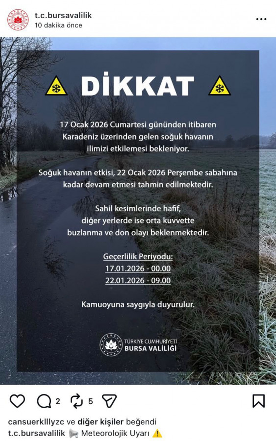 Yurt genelinde soğuk hava dalgası etkili olacak. Bursa'da etkisini gösterecek olan soğuk hava dalgasına karşı peş peşe uyarılar geldi. Bursa Valiliği'nden bir son dakika uyarısı daha geldi...