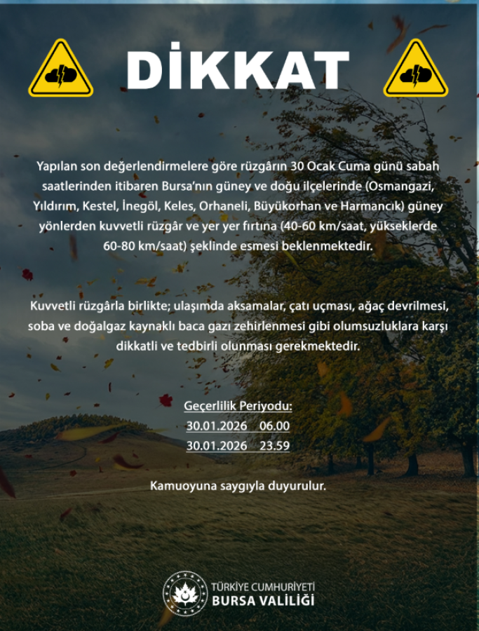 Bursa Valiliği, Meteoroloji'den alınan son değerlendirmeler doğrultusunda 30 Ocak Cuma günü için kent genelini ilgilendiren önemli bir uyarı yayımladı. Açıklamaya göre, sabah saatlerinden itibaren Bursa'nın güney ve doğu ilçelerinde güney yönlerden kuvvetli rüzgâr ve yer yer fırtına bekleniyor.