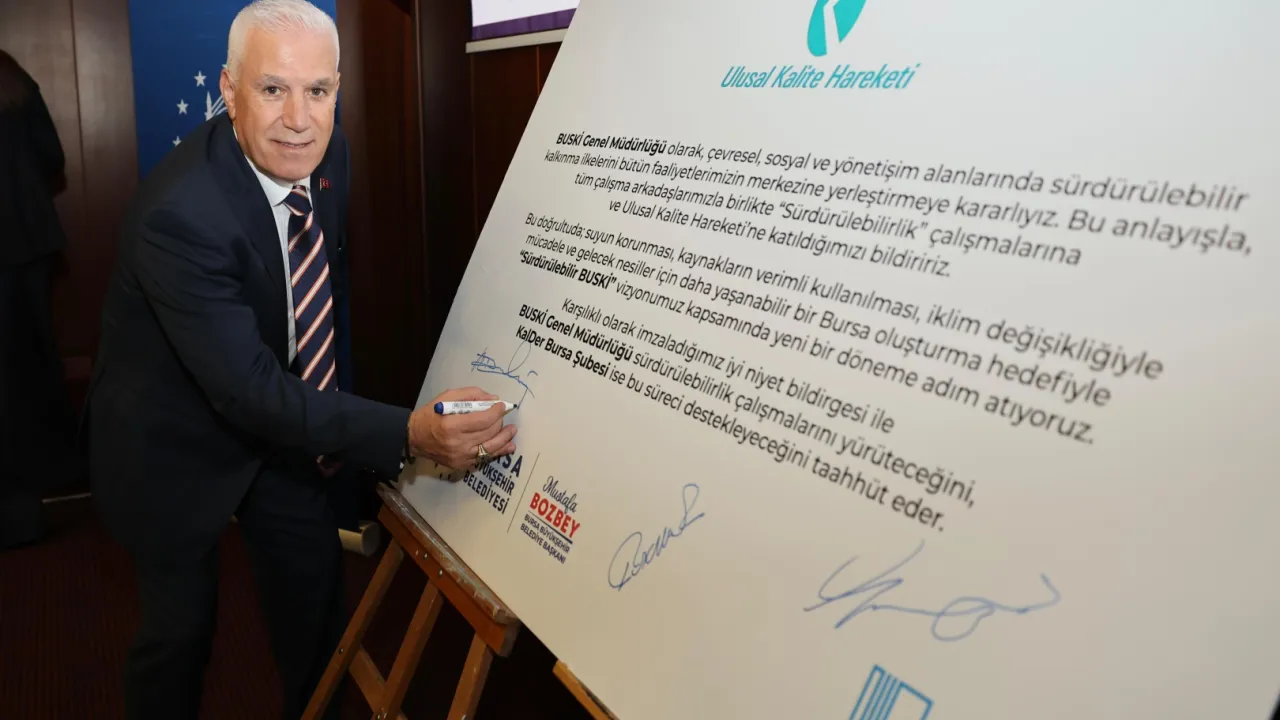 Bursa Büyükşehir Belediyesi ve KalDer arasında BUSKİ'nin yönetim modeli ile hizmet anlayışını mükemmellik ve sürdürülebilirlik temelinde yeniden şekillendirecek 'Ulusal Kalite Hareketi İyi Niyet Bildirgesi' imzalandı. Başkan Mustafa Bozbey, 'Suyun bir damlasının bile heba edilmemesi için önemli bir adım atıyoruz' dedi.