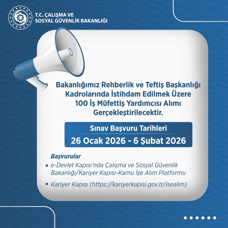 Çalışma ve Sosyal Güvenlik Bakanlığı, Rehberlik ve Teftiş Başkanlığı kadrolarında istihdam edilmek üzere 100 İş Müfettiş Yardımcısı alımı yapacağını duyurdu. Başvuru tarihleri 26 Ocak-6 Şubat 2026 olarak açıklandı.