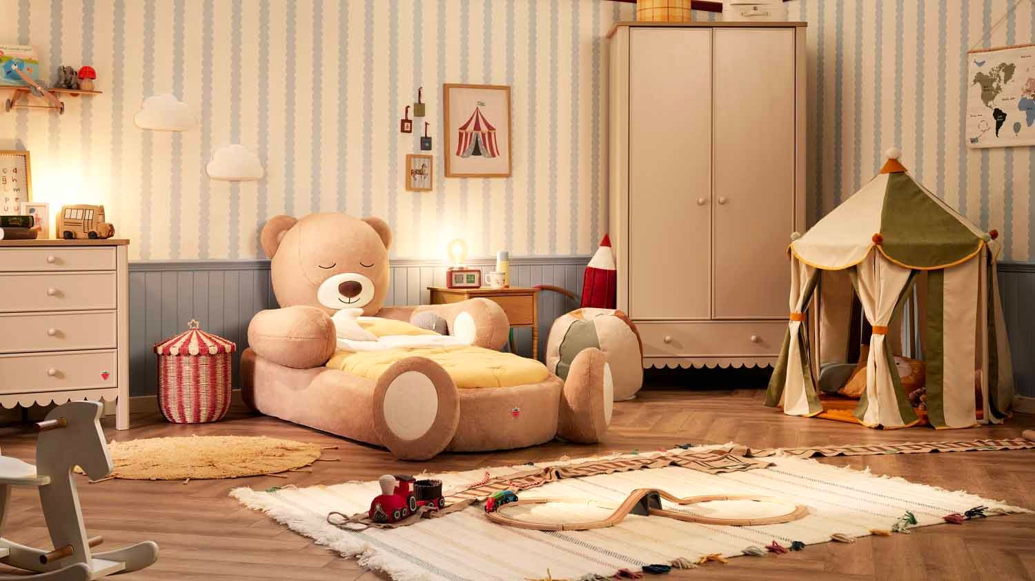 Yumuşak hatları ve sevimli duruşuyla odanın atmosferini değiştiren Teddy Ayıcık Karyola, gündüz hayallerin şekillendiği bir oyun alanı; akşam olduğunda ise sakin ve güvenli bir uyku köşesi olarak konumlanıyor.