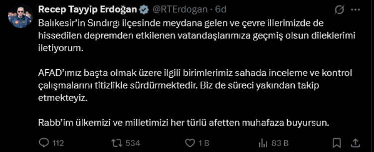 Cumhurbaşkanı Erdoğan, Balıkesir'in Sındırgı ilçesinde meydana gelen deprem ardından sosyal medya hesabından paylaşımda bulundu.