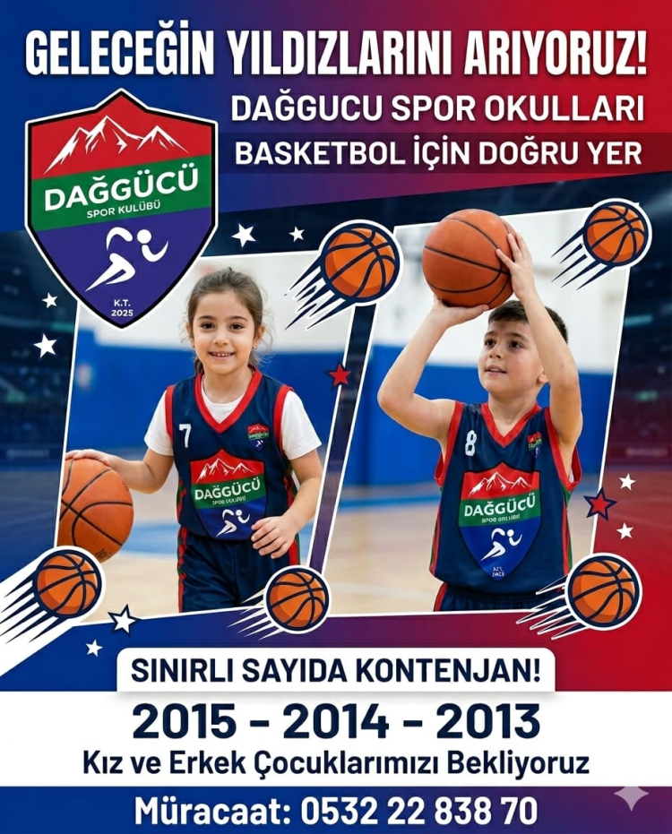 'Geleceğin Yıldızlarını Arıyoruz' sloganıyla çalışmalarını sürdüren Dağgücü Spor Okulları, basketbola doğru yerde başlamak isteyen çocuklara güvenli, disiplinli ve gelişim temelli bir eğitim ortamı sunuyor. Uzman antrenör kadrosu eşliğinde yürütülen programda temel teknik eğitimden maç tecrübesine kadar kapsamlı bir gelişim süreci uygulanıyor.