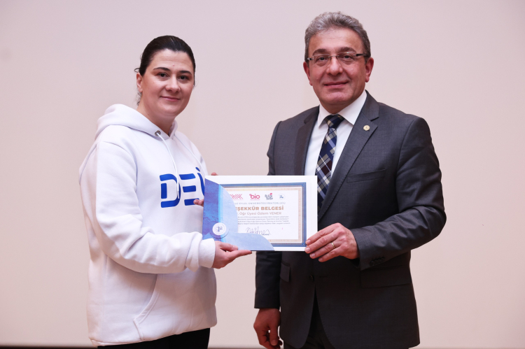Bilim Kafe Sohbetleri, katılımcıların sorularının yanıtlandığı interaktif bölümün ardından sona erdi. Programın sonunda DEÜ Rektörü Prof. Dr. Bayram Yılmaz, Dr. Öğr. Üyesi Özlem Yener'e teşekkür belgesi takdim etti.