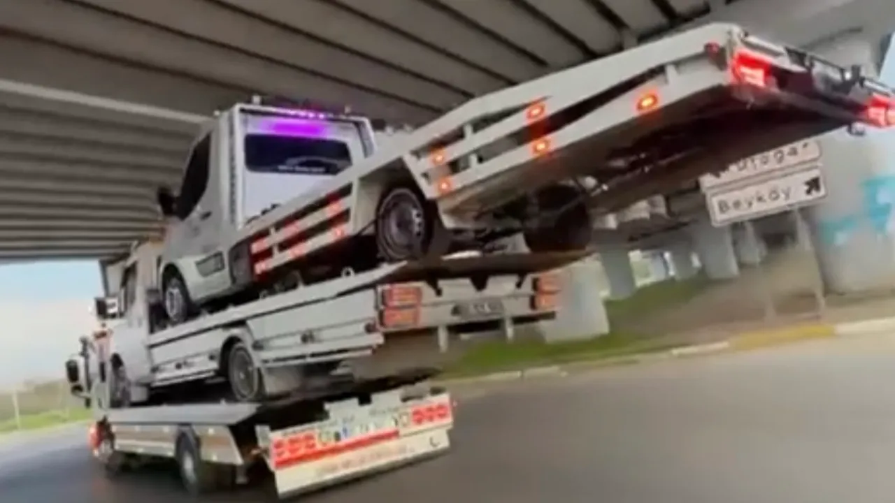 Bir çekicinin üzerine iki çekicinin daha yüklenerek seyir halinde olması, trafikteki diğer sürücülerde tedirginliğe sebep oldu.