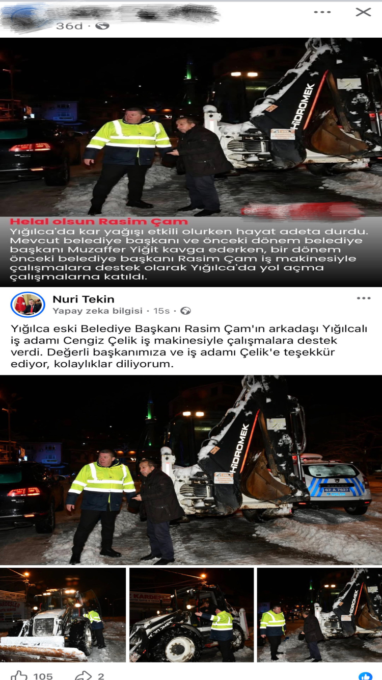 Gazeteci Sefer Demir, Yığılca'ya yönelik 'yardım ve hizmet' olarak paylaşılan videoların, aslında Alaplı Belediye Başkanı Nuri Tekin'in sosyal medya hesaplarında yer alan görüntülerle birebir örtüştüğünü ortaya koydu. Demir, söz konusu paylaşımların Alaplı'daki çalışmalara ait olduğunu belge ve karşılaştırmalarla kamuoyuna sundu.