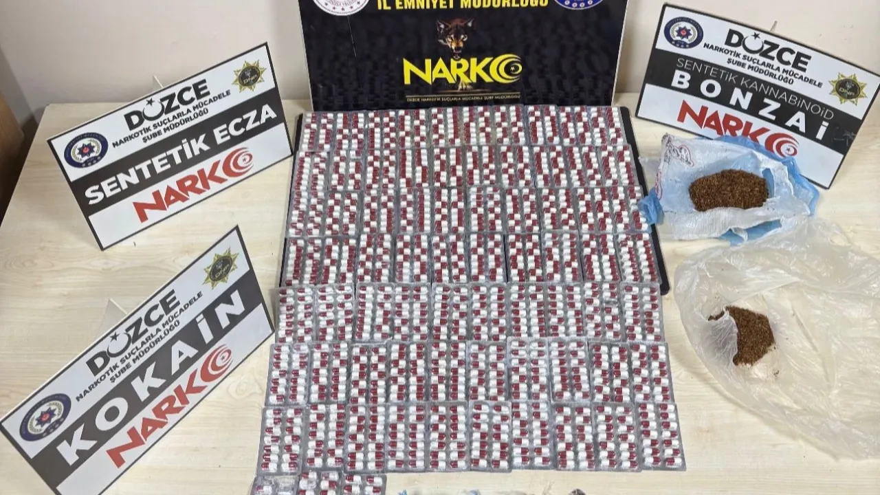 Düzce'de 2 ve 4 Ocak 2026 tarihlerinde gerçekleştirilen operasyonda, 2 parça halinde 6 gram sentetik kannabinoid ham maddesi (yaklaşık 600 gram sentetik kannabinoid elde edilebilecek), bin 566 adet Gerica sentetik ecza, 1 parça halinde 1 gram kokain ve 2 parça halinde 65 gram sentetik kannabinoid maddesi ele geçirildi.