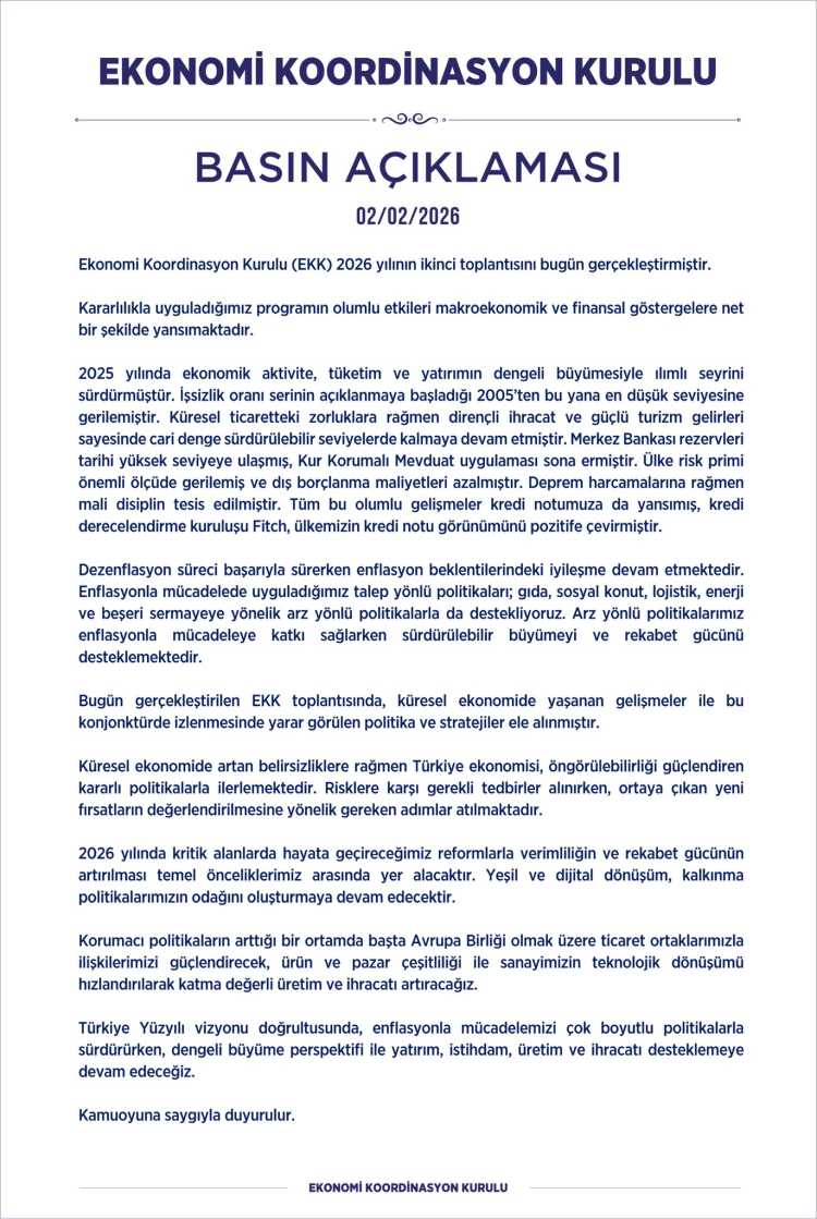 Cumhurbaşkanı Yardımcısı Cevdet Yılmaz, Ekonomi Koordinasyon Kurulu (EKK)'nun 2026 yılının ikinci toplantısı sonrası yaptığı açıklamada, Türkiye ekonomisinin güçlü makroekonomik göstergelerle yoluna devam ettiğini ve 2026'da enflasyonla mücadele ile yeşil-dijital dönüşümün öncelik olacağını duyurdu.