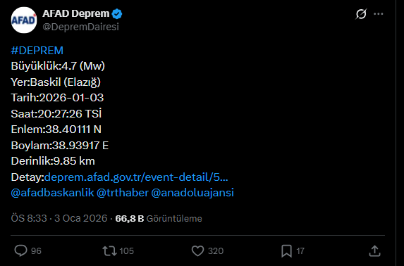 AFAD’dan yapılan açıklamada, depremin yerin 9.85 kilometre derinliğinde meydana geldiği bildirildi. Sarsıntının merkez üssünün Baskil ilçesi olduğu belirtildi. Depremin ardından ilk belirlemelere göre olumsuz bir durum bildirilmedi.