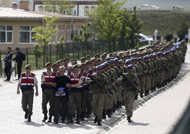 Fetullahçı Terör Örgütü'nün (FETÖ) darbe girişiminde Genelkurmay Karargahı'nda yaşananlara ilişkin 221 sanıklı çatı davanın tutuklu sanıkları duruşma salonuna götürülmek üzere cezaevinden çıkarıldı. Sincan Ceza ve İnfaz Kurumundan jandarma komandoları eşliğinde çıkarılan Akın Öztürk (önde), Mehmet Partigöç, Mehmet Dişli, Gökhan Şahin Sönmezateş ve İlhan Talu'nun aralarında bulunduğu sanıklar, dava nedeniyle cezaevi önünde toplanan ve ellerinde Türk bayrakları bulunan çok sayıda vatandaş tarafından protesto edildi