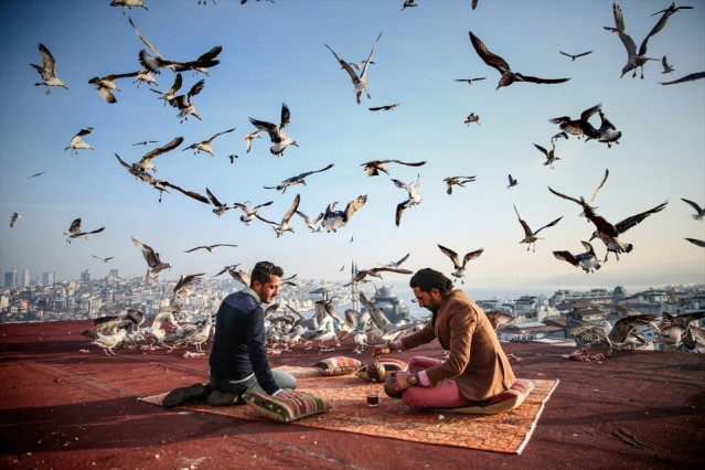Eminönü Sağır Han’da bulunan ‘Kubbe İstanbul’ isimli kültür ve sanat merkezinin sahipleri Harun Reşit Göktaş ve Fahri Akdağ (sağda), kahvaltılarını çalışanlarıyla iş yerlerinin terasından görünen İstanbul manzarası eşliğinde yapıyorlar. Zaman zaman merkezi ziyaret eden misafirleri ve turistleri de bu manzaradaki kahvaltıya davet eden mekan sahipleri, misafirlerine hem eşsiz bir İstanbul manzarası görmeleri imkanını veriyor hem de İstanbul’un simgesi haline gelen martılar eşliğinde tarihin seyrinde kahvaltı yapmalarını sağlıyor.