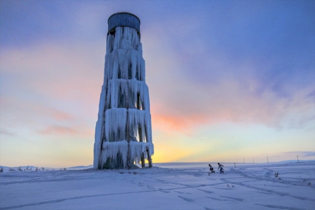 Van'da dondurucu soğuklar nedeniyle boruları patlayan su deposu, akan suların donmasıyla buz kulesine dönüştü.