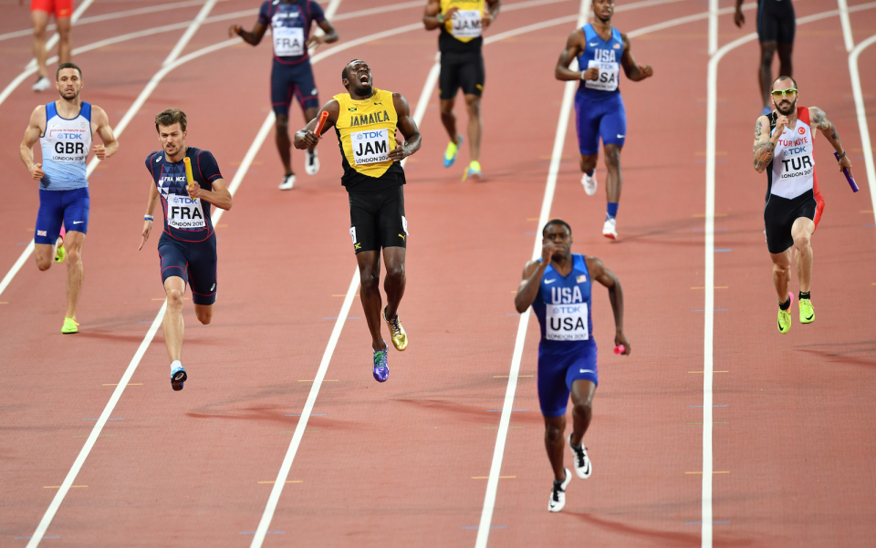 Dünya Atletizm Şampiyonası erkekler 4x100 metre bayrak yarışı finali yapıldı. Son 100 metreyi koşan olimpiyat ve dünya şampiyonu rekortmen atlet Usain Bolt (sol 3), sakatlanarak yarışı yarıda bıraktı.