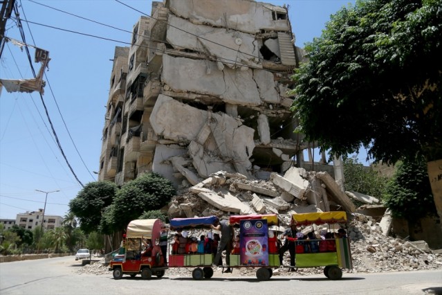 Suriye'nin başkenti Şam'ın Doğu Guta bölgesindeki Arbin ilçesinde, sivil savunma ekipleri çocuklara mesleklerini tanıtmak için bayram etkinliği yaptı. Görevliler, çocukları trene bindirerek gezdirdi.
