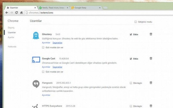 chrome://extensions yazarak yüklü tüm uzantıları kontrol edebilir ve yapılandırabilirsiniz.