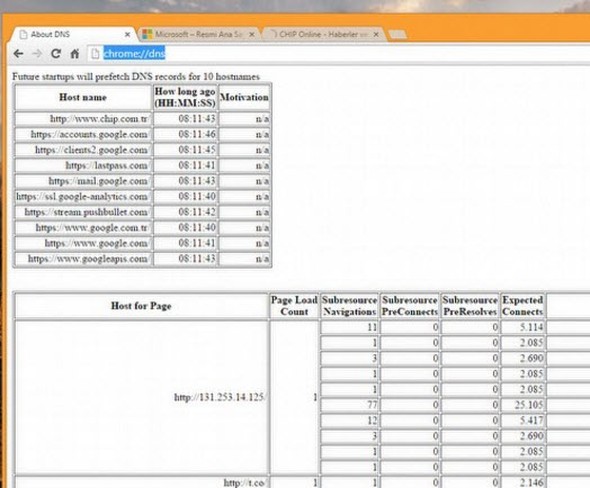 net-internals altında (veya chrome://net-internals/#dns komutunu kullanarak) DNS ayarlarınızı gözden geçirebilirsiniz.