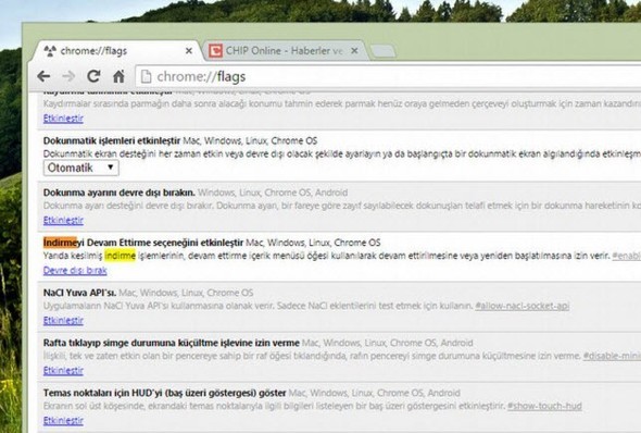 Adres çubuğuna chrome://flags yazarak grafik hızlandırma gibi Chrome'un deneysel işlevlerini etkin hale getirebilirsiniz. Bu sayfadaki işlevleri kullanırken dikkat edin - henüz geliştirilme aşamasında olan bu işlevler, eksik çalışabilir veya tarayıcınızın kararlılığını olumsuz etkileyebilir.