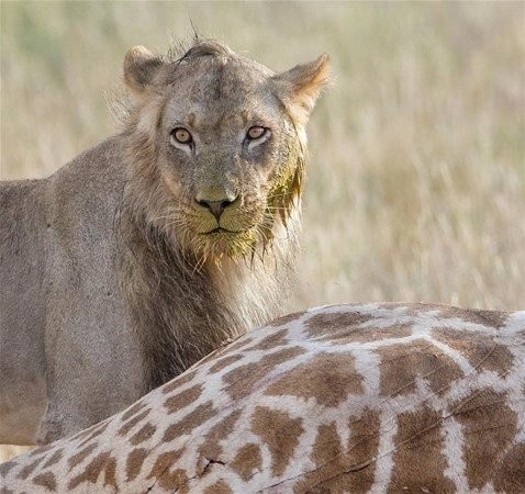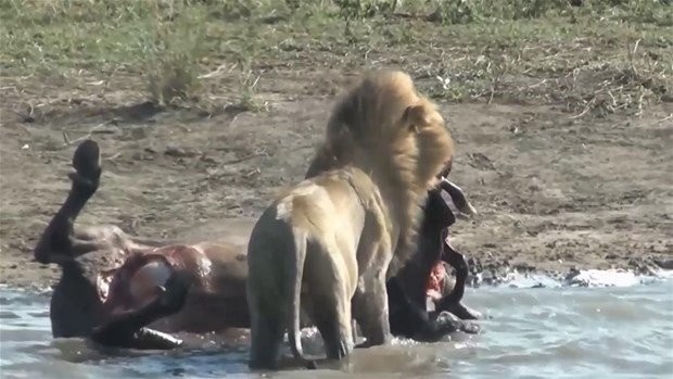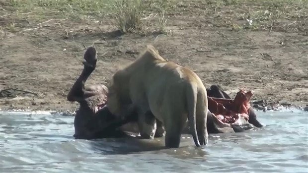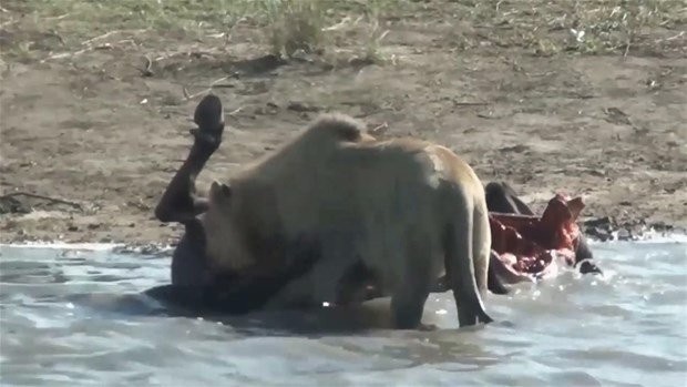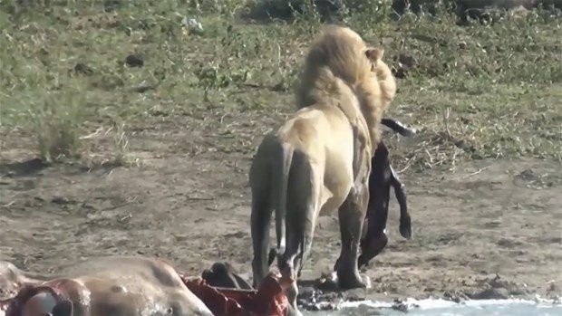 Olay yerine gelen aslan ise, bufalonun karnını deşmeye başladı.