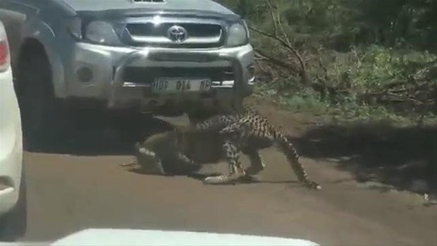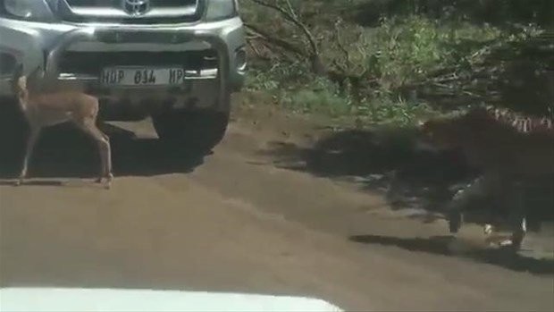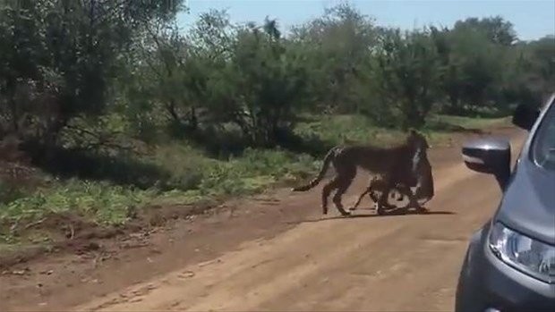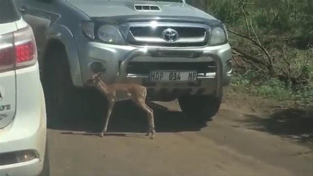 Güney Afrika'da bulunan Kruger Ulusal Parkında safari yapan turistlerin bulunduğu aracın önüne geçen impala çitalardan korunmaya çalışıyor.