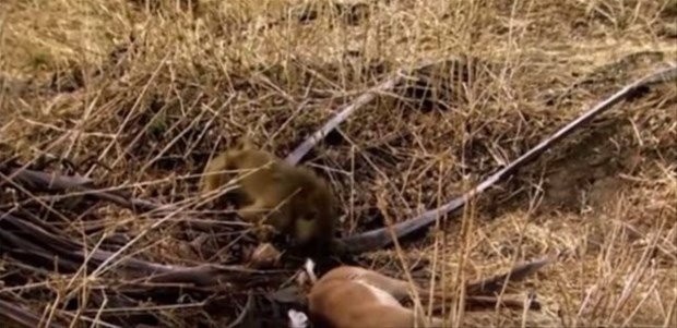 Vahşi aslanın yavruyu annesinin karnından çıkararak yemek üzere çalılıkların yanına götürmesi, saniye saniye kameralara yansıdı.