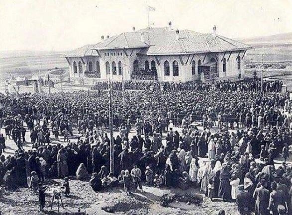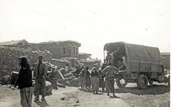 Yunanlıların Sakarya Savaşı esnasında Haymana köylerinden toplayıp götürdükleri Türk erkek ve kadınlar. Fotoğraf Yunanlı fotoğrafçı askerlerce çekilmiştir.Yıl: 1921
