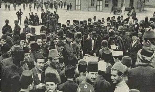Seferberlik ilanı sonrası Gelibolu Cephesi'ne gönüllü gitmek için başvuranlar. İstanbul/1915.